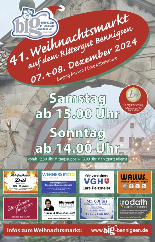 Alle Mitglieder und andere Institutionen die diesen BIG-Weihnachtsmarkt 2023 unterstützt haben: Immanual von Bennigsen; Malerfachbetrieb Zwick - Inh. Sven Behrnd; Werners Multi-Service; Bestattungsinstitut Elvira Pfohl GmbH; Seifert Haustechnik; Krause u. Blümchen GbR - EDV-Service; ANDELIS GmbH; Steuerberater Bennigsen - Jonas Dauter; Volksbank eG Hildesheim-Lehrte-Pattensen; Dr. Riegelmann & Kollegen; Gisann Home Style; Gniesmer, Volker; GrünForm Achtermann GmbH; iPark Media GmbH - Timo Hähne; Mr.60Plus der Handwerker für Senioren - Carsten Kopp; Musikverein Bennigsen e.V.; Optik am Denkmal - Günter Schulz; RODATH Werbetechnik - Andreas Rodath e.K.; Süllberg Apotheke; Tierarztpraxis Bennigsen - Dr. Katrin Schwabe; VGH Versicherung Lars Pelzmeier; WSV Bennigsen von 1952 e.V.; architekt wunder gmbH; AWO Bennigsen; Brandt, Klemens - Ortsbürgermeister; Feise´s Freilandeier - Ilse Feise; Gut Bennigsen gGmbH; Kingsheaven; LandFrauen Springe; Menert Bauunternehmen GmbH; Nordik-Care Seniorenresidenz Bennigsen GmbH; Ortsrat Bennigsen; Praxis für Osteopathie Ilka Bieniek; Rhode Bau; Sanders Landhof; Tennisverein Bennigsen e.V.; Wallus GmbH; Sparkasse Hannover; Denecke Baustoffe GmbH & Co. KG; verschiedene Kunsthandwerker.
